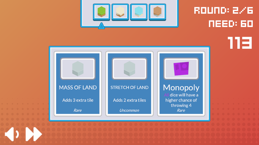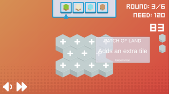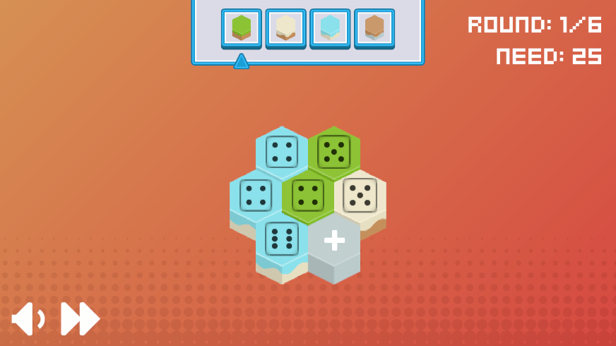 I love the idea. The game looks great, plays great and the audio is fantastic. I just feel like I don't have much control over the outcome. Even if I place all of my tiles on the most optimal spot, if I roll bad I am just screwed. I think the concept has a lot of potential though, but I feel like it's missing like 1 element of player input between rolling the dice and placing the landmass. Either way, great job on the jam! Very polished looking result. Kudos!